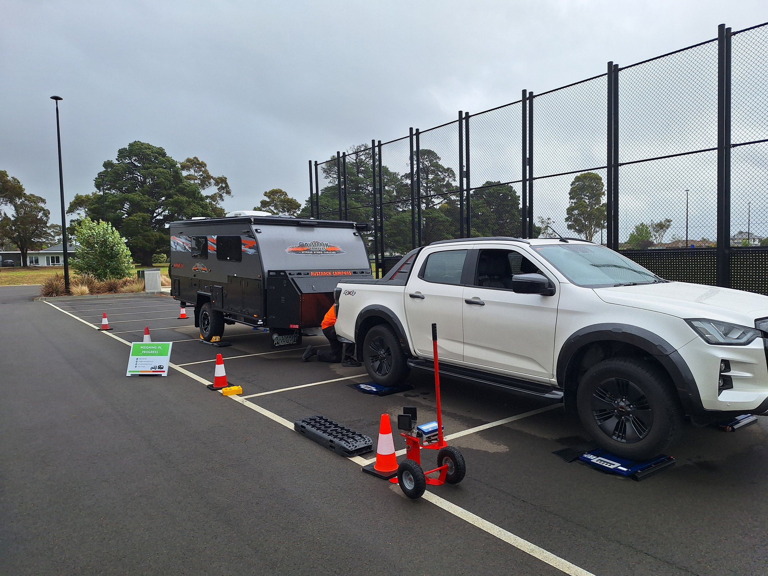 We weighed a handsome combination for local clients, a new Essential caravan, towed by a Ford Ranger. Both car and caravan were legal, with green ticks against all key metrics.